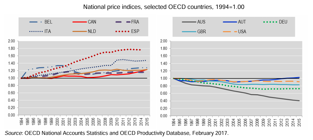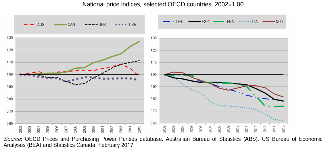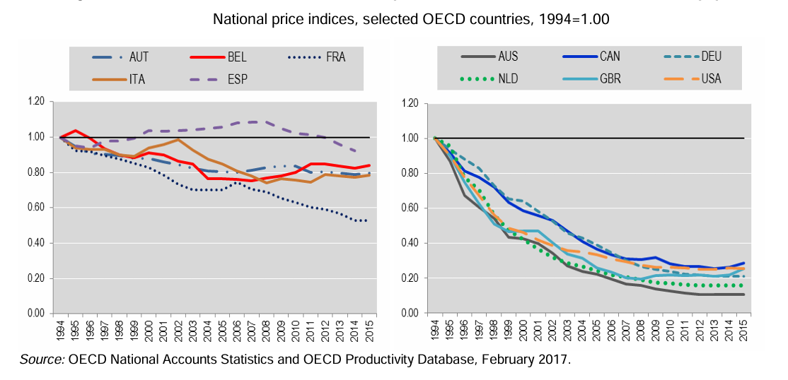 数字化经济活动呈现出高度无形化、跨境化和去中心化特征,这使得宏观统计在捕捉产出、投资和消费时面临局限,其中最典型的问题体现在价格指数与产出量测度上。信息通信技术(ICT)产品更新迭代迅速,质量提升频繁,如果价格指数未能及时进行质量调整,官方数据就可能高估价格、低估产出增速。报告中通过国际比较揭示了巨大的价格指数差异:例如在1994至2015年间,美国、德国和澳大利亚的ICT设备价格下降幅度高达70%至90%,而西班牙和意大利几乎未显示显著下降。类似的问题还存在于计算机软件和通信服务价格测度中,尤其是软件中包含大量内部开发部分,难以进行跨期和跨国可比的价格调整。