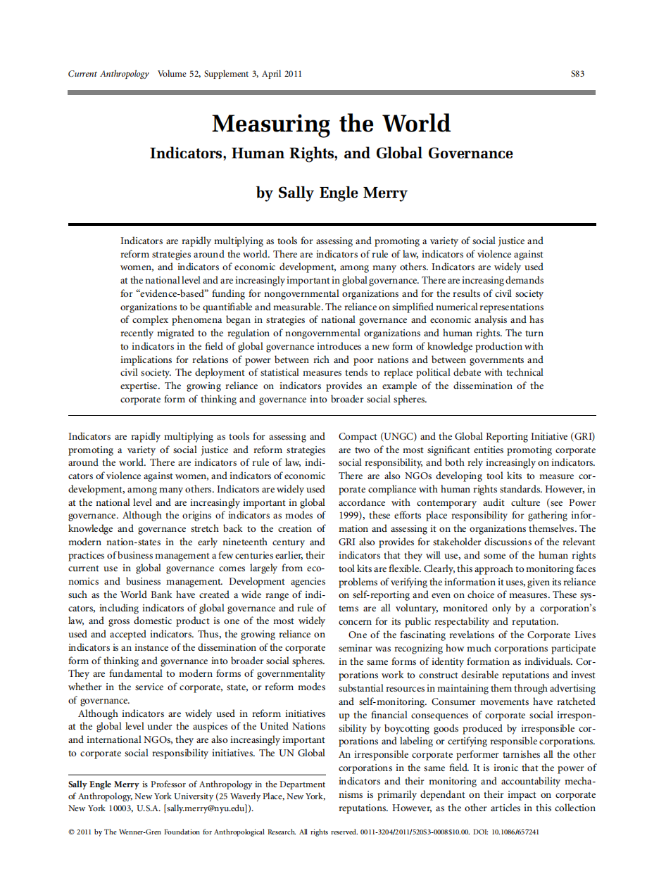 Merry, Sally Engle. 2011. Measuring the World: Indicators, Human Rights, and Global Governance. Current Anthropology 52 (S3): S83–95.