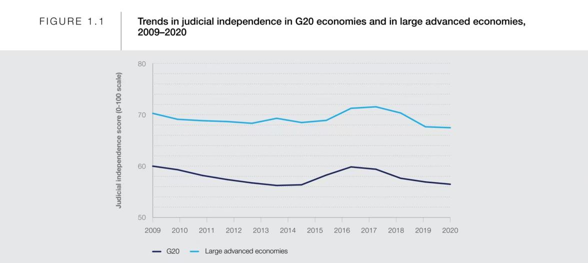 图3 2009-2020年G20与大型发达经济体司法独立性趋势