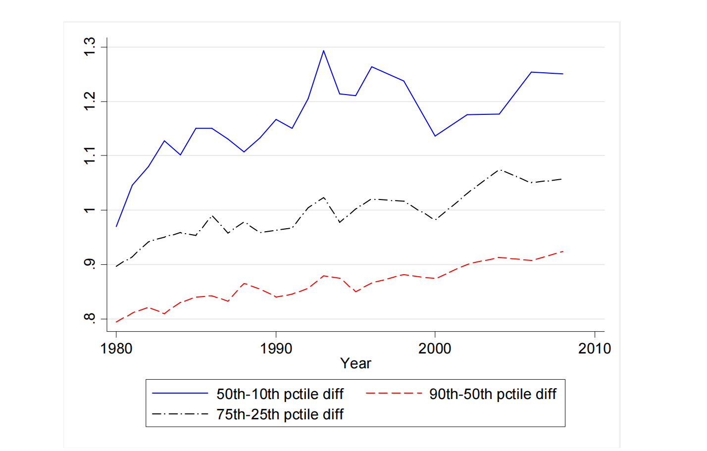 注释:图中曲线分别反映不同分布区间收入差距的演变趋势,其中等价化处理用于消除家庭规模差异对收入不平等测度的影响,数据来源于收入动态面板研究(PSID),直观呈现1980-2010年美国收入不平等的整体变化。