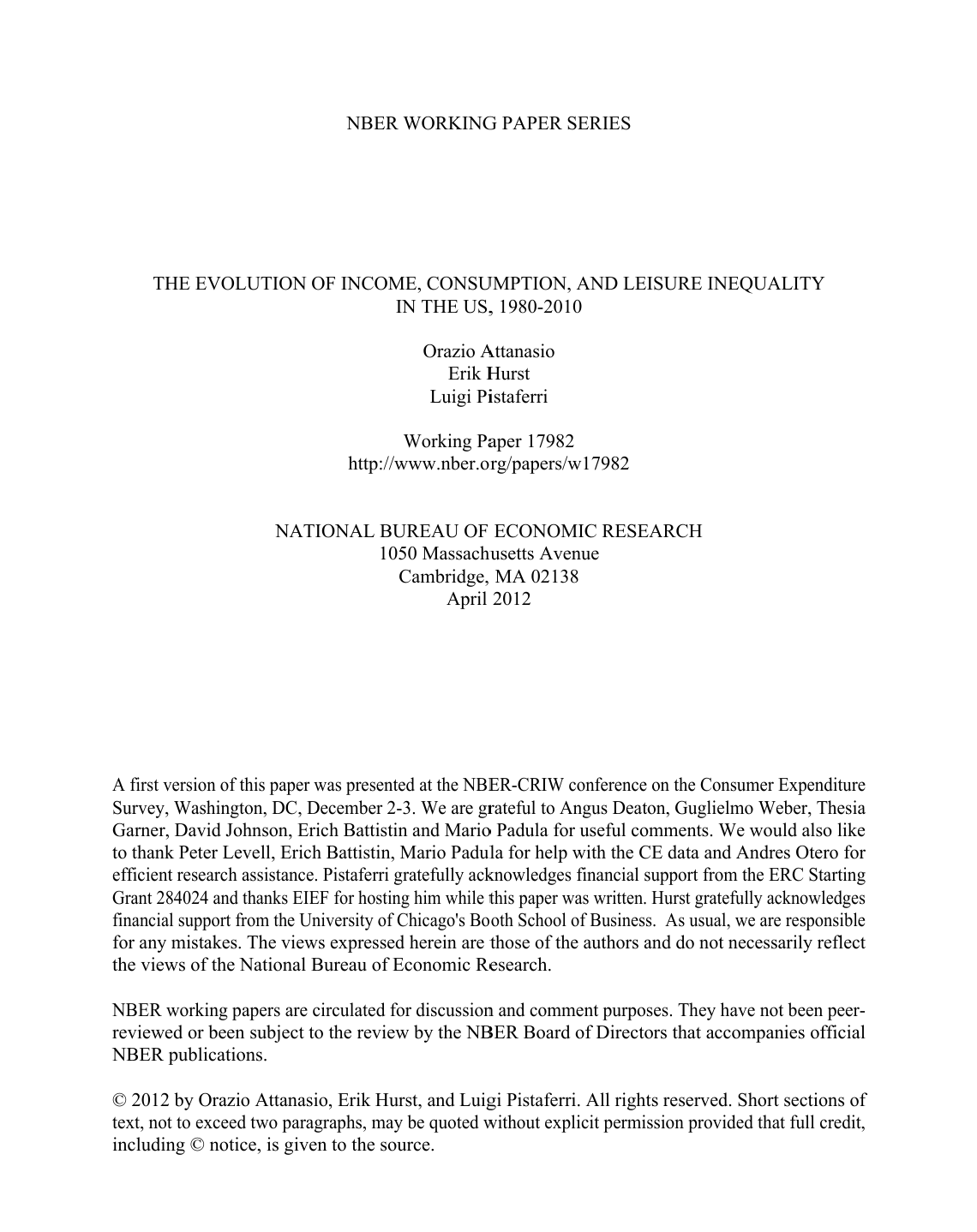 Attanasio,Orazio, Erik Hurst, and Luigi Pistaferri. 2012. The Evolution ofIncome, Consumption, and Leisure Inequality in the US, 1980-2010.w17982. Cambridge, MA: National Bureau of Economic Research.