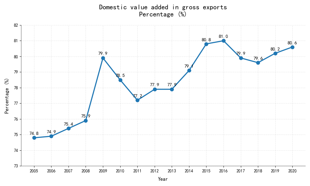 这种对统计方法论的忽视可能带来严重的误判。例如在中美贸易摩擦初期,仅依据贸易顺差占GDP比重较小就断言影响有限的观点,显然忽略了全球经济紧密相连、产业链深度交织背景下可能产生的复杂间接效应。如图5所示,中国的国内增加值在总出口中的占比变化体现了全球价值链背景下的复杂依存关系。经济增长的直接贡献与间接影响是不同层面的问题,将它们混为一谈势必导致认知的偏差。