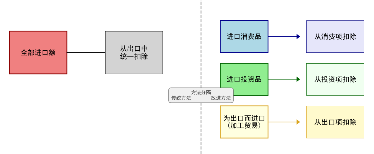 问题的核心在于进口额应当如何从GDP中扣除。如图3所示,当前的做法是将所有进口——无论是消费品、投资品还是中间产品——统一从出口额中扣除,从而得出净出口。张启迪博士指出,这种处理方式忽略了经济活动的实质。进口的消费品和投资品,其本质是满足了国内的最终需求,它们与出口并无直接关联。因此,更符合经济逻辑的做法应当是:进口消费品从消费项中扣除,进口投资品从投资项中扣除,而仅将与出口直接相关的进口部分(主要是加工贸易)从出口中扣除。