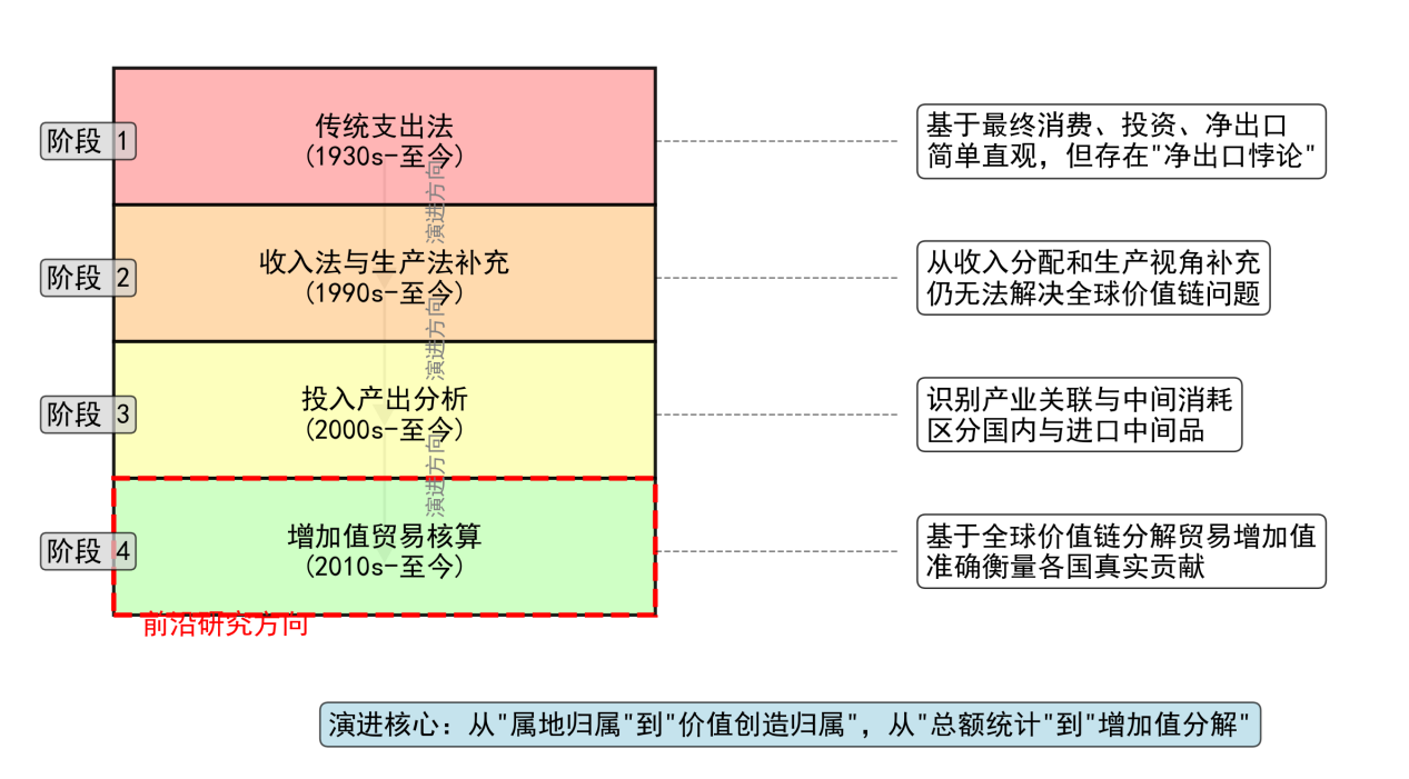 这就将我们引入了一个经济统计学中的深层困境:在确保GDP总量准确性与清晰呈现经济结构之间,存在着难以完全调和的矛盾。如图4所示的GDP核算方法论演进图,展示了这一困境的历史发展脉络。