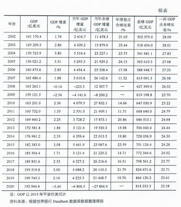 从核心经济体的表现来看,美国是发达阵营中唯一保持相对稳定增长的主体。1993-2020年,美国固定价格GDP从10.42万亿美元增长至19.29万亿美元,28年总量近乎翻倍;但增长动能的放缓肉眼可见,1994-2007年美国年均GDP增量为4236亿美元,2010-2019年这一数值降至4062.4亿美元,对全球增长的年均贡献度也从1994-1999年的33%以上,降至2010-2019年的17.90%。其GDP占全球的比重也从1999年28.64%的峰值,一路降至2020年的23.58%,十余年时间下降了3个百分点。