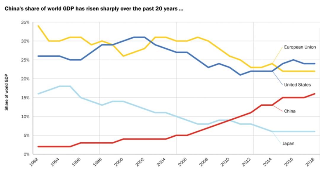 图21992-2018年美、欧、中、日GDP全球占比变化