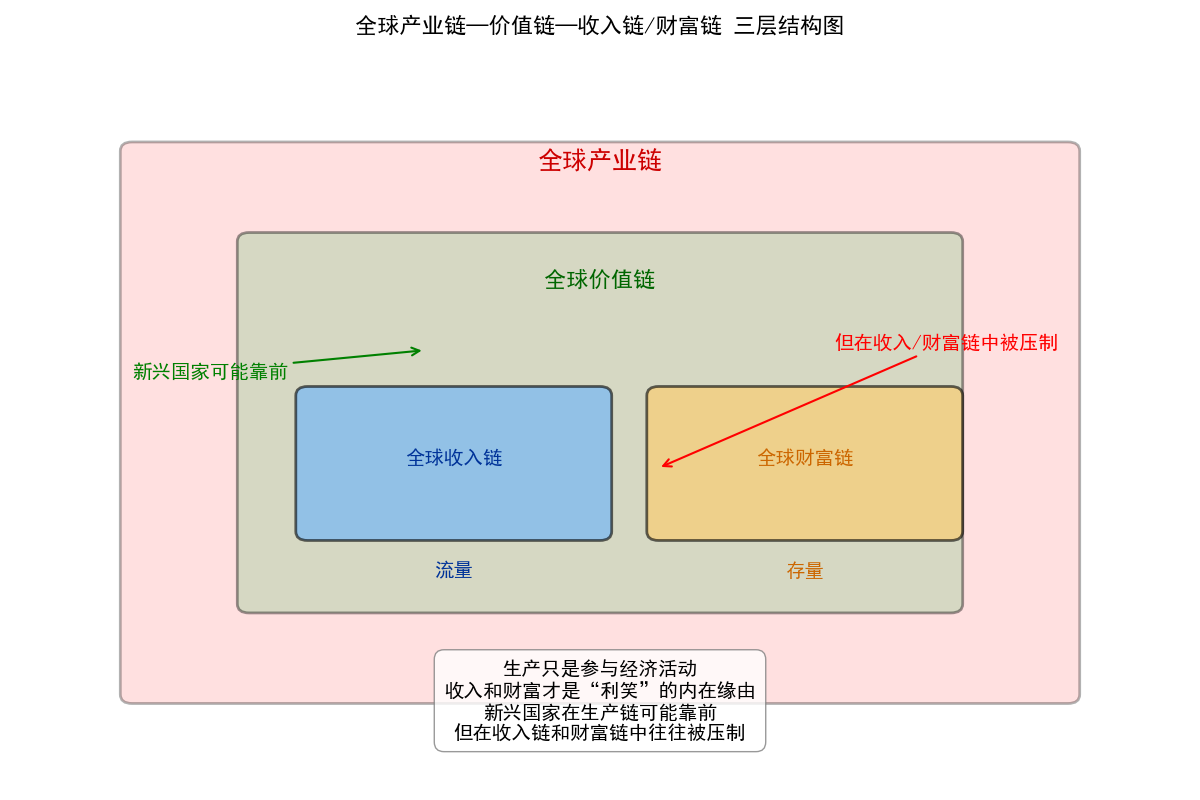 全球产业链背后,是全球价值链、收入链和财富链的多重结构。生产只是参与经济活动,收入和财富才是“利笑”的内在缘由。新兴国家在“全球生产链”中可能靠前,部分产业进入中端,但在“全球收入链”和“全球财富链”中则未必,往往被发达国家阻挡在低端。