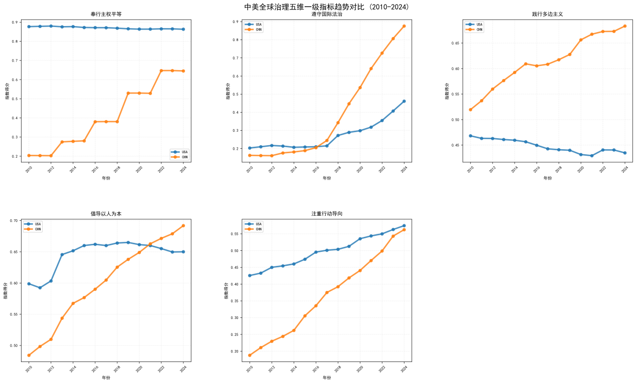 图2中美全球治理五维一级指标趋势对比(2010-2024)