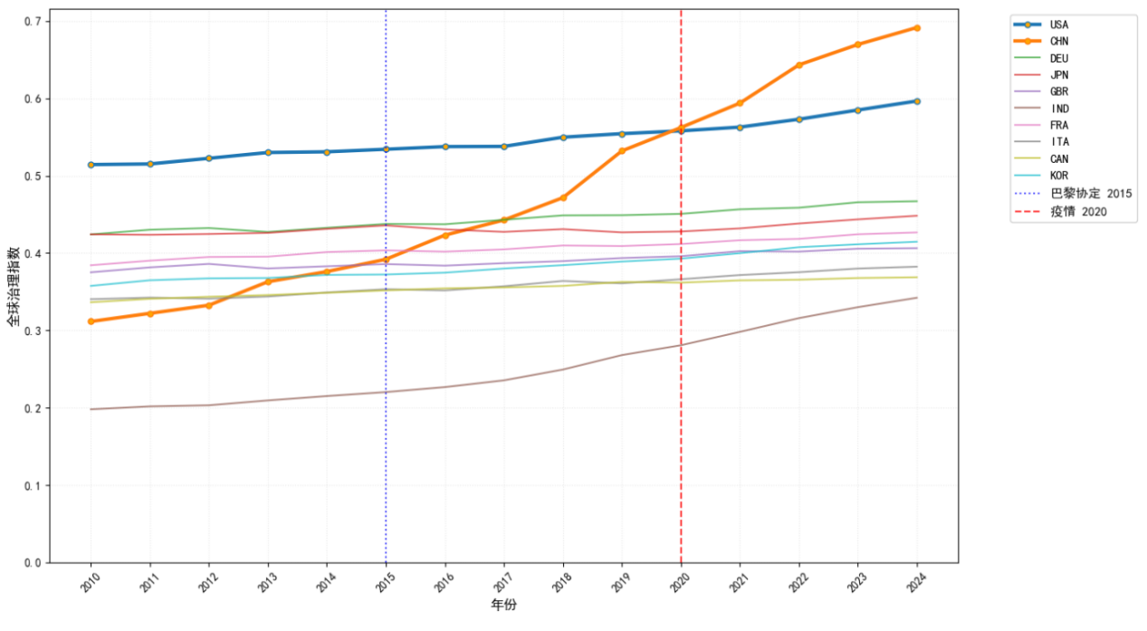 趋势分析显示,美国在全球治理评估中长期处于领先地位,其治理指数在2010—2020年间相对平稳,体现了其深厚的制度性参与优势。2020年是一个关键转折点。新冠疫情作为一次全球治理压力测试,使各国固有的发展路径分化更加明显,中国在多边协调、疫苗援助等抗疫合作中展现了快速行动能力,推动其指数持续攀升;而美国等发达国家虽在初期面临应对挑战的考验,但依托制度韧性维持基本盘。此消彼长之间,中国治理指数在该年度首次实现对美国的反超。2024年,中国治理指数(0.692)已明显领先于美国(0.597)。这一位次转换反映了两种治理逻辑的差异,美国更强调主权平等与制度保障,中国则注重规则参与和多边协调。两种模式并非零和博弈,而是形成了竞争共存的复杂格局。