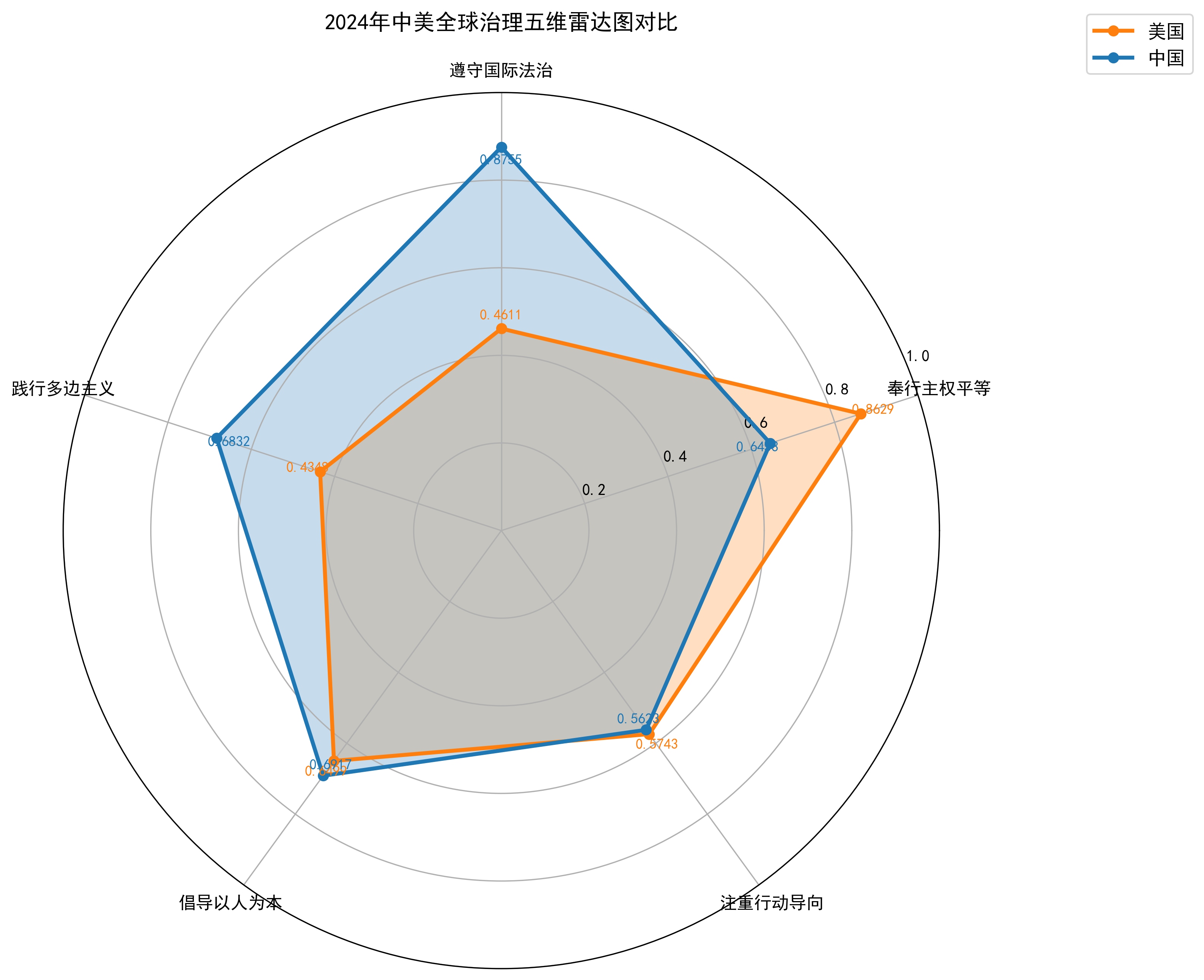 2024年数据显示,中美两国在全球治理五个维度上形成了互补型结构。中国在“遵守国际法治”(0.8755)和“践行多边主义”(0.6832)维度上表现突出,反映出其近年来在多边机制中的深度参与和对国际规则的积极适配。美国则在“奉行主权平等”(0.8629)和“倡导以人为本”(0.6499)方面保持优势,体现了其传统外交理念与制度保障的延续性。在“注重行动导向”维度,两国表现接近(中国0.5623,美国0.5743),显示出在务实合作领域的趋同态势。
