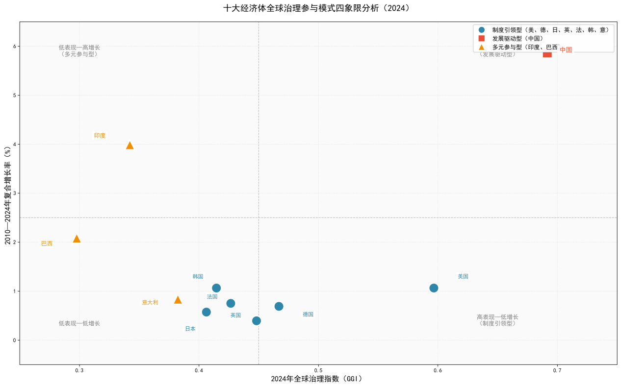 基于2024年五维一级指标对十大经济体进行聚类分析,可识别出三种典型的治理参与模式。