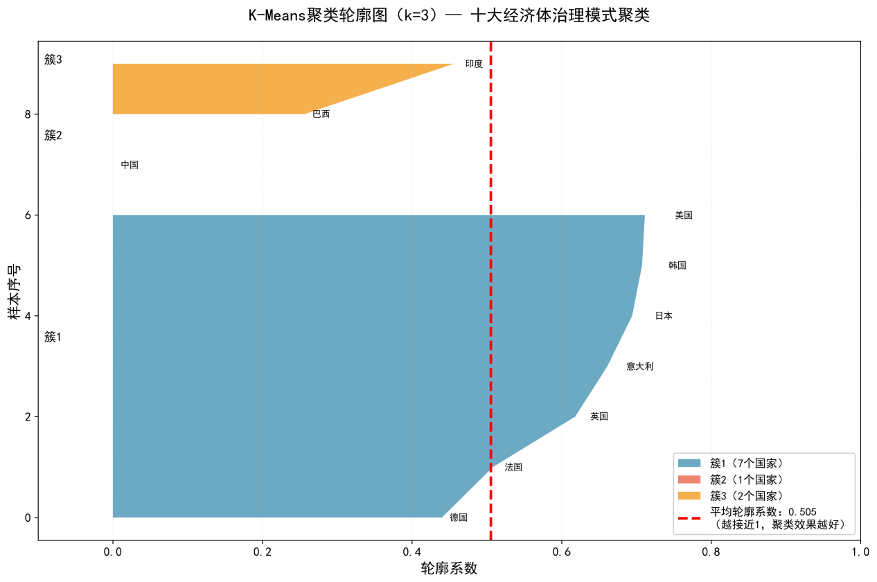 轮廓图的聚类结果进一步验证了上述分类的合理性。K-Means聚类依据五个维度的得分将十大经济体划分为三个群组。中国形成独立群组,其多维表现活跃且增长强劲,对应“发展驱动型”;美国、德国、日本、英国等发达国家构成另一群组,在“遵守国际法治”和“践行多边主义”维度上得分较高,呈现高位稳态特征,属于“制度引领型”;印度、巴西等新兴经济体则形成第三类群组,虽然综合指数相对居中,但在关键议题领域增速显著,体现出“多元参与型”的活跃态势。三类群组的分布特征与四象限图呈现的模式基本吻合,共同支撑了全球治理多元模式的划分。