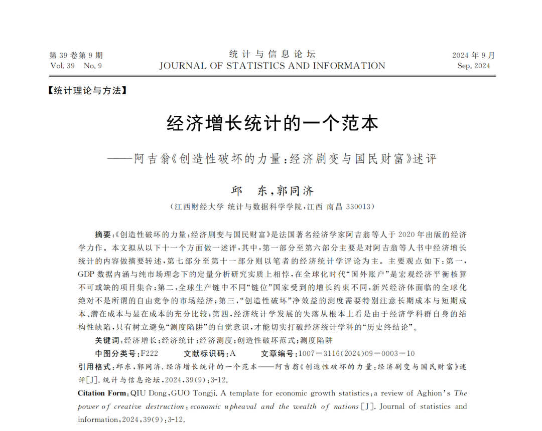 该文发表于《统计与信息论坛》2024年第9期,其核心观点由邱东教授在第十七届全国经济统计学年会上作特邀报告,引发了与会学者的深入探讨与广泛共鸣,后收录于邱东教授2024年出版的专著《事理与数理的纠缠与厘清》中,属于其“当代经济统计学批判系列”重要成果之一。邱东教授从经济统计学专业视角出发,对阿吉翁著作中的经济增长统计框架、创造性破坏测度方法、竞争与不平等指标、以及国民核算体系的结构性问题等进行了深入剖析,并提出具有独立见解的评论与拓展思考,不仅呼应了阿吉翁理论的核心议题,也体现了国势研究院在该领域的研究探索。