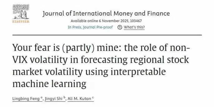 近日,江西财经大学统计与数据科学学院副教授、国势研究院副院长冯凌秉与南开大学经济学院石婧仪(原我校金融学院21级本科生)、美国南伊利诺伊大学爱德华兹维尔分校Ali M. Kutan教授合作完成的论文《Your fear is (partly) mine: The role of non-VIX volatility in forecasting regional stock market volatility using interpretable machine learning》被国际金融学权威学术期刊《Journal of International Money and Finance》正式接收发表。冯凌秉副教授为论文第一作者,我校为第一完成单位。